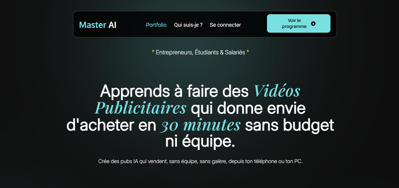 J'ai créer cette page de vente pour moi, une page aligné avec mon identité pour me permettre de vendre ma formation en création de vidéos publicitaires avec l'IA.